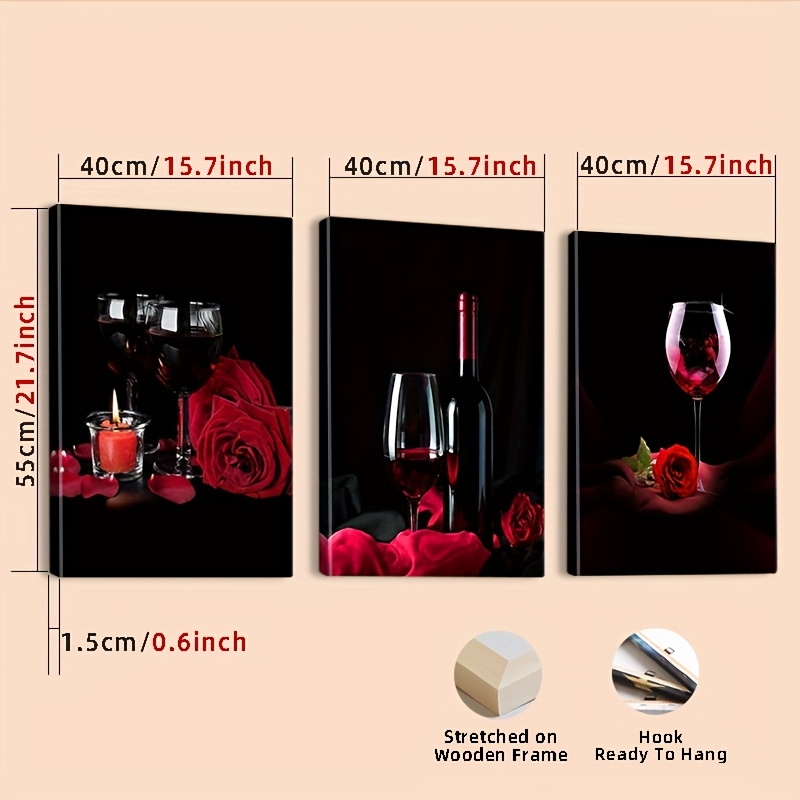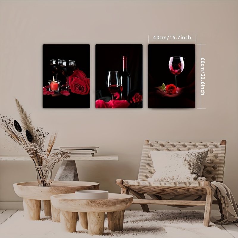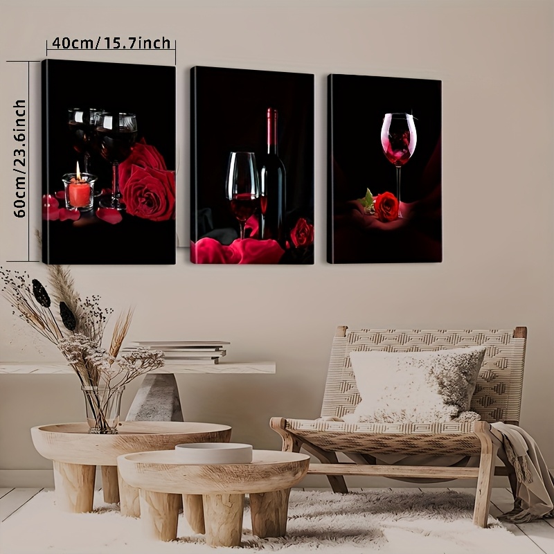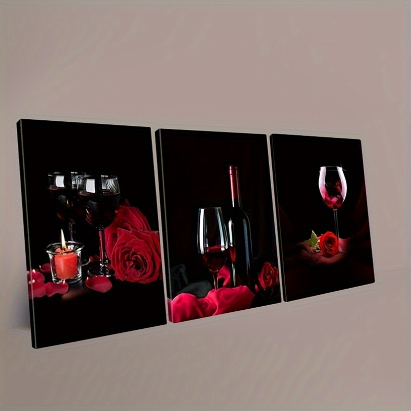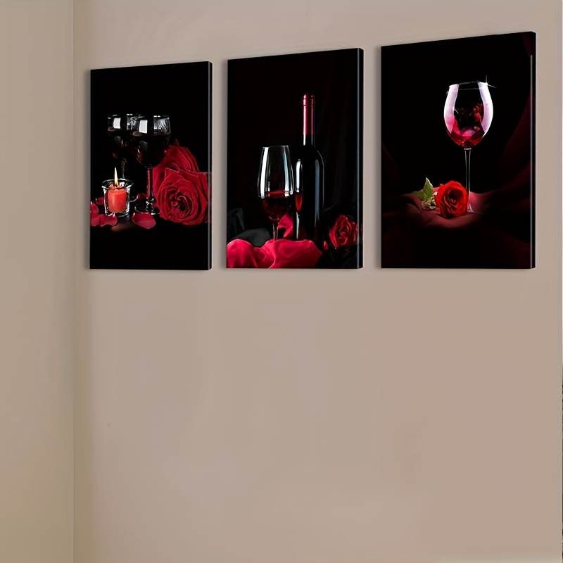 3pcs Cadre en Bois Art sur Toile, Verres à Vin et Roses, Vin Rouge, Décoration de Bar, Art Moderne de Luxe Léger, Décoration Murale Intérieure [2D Plat]