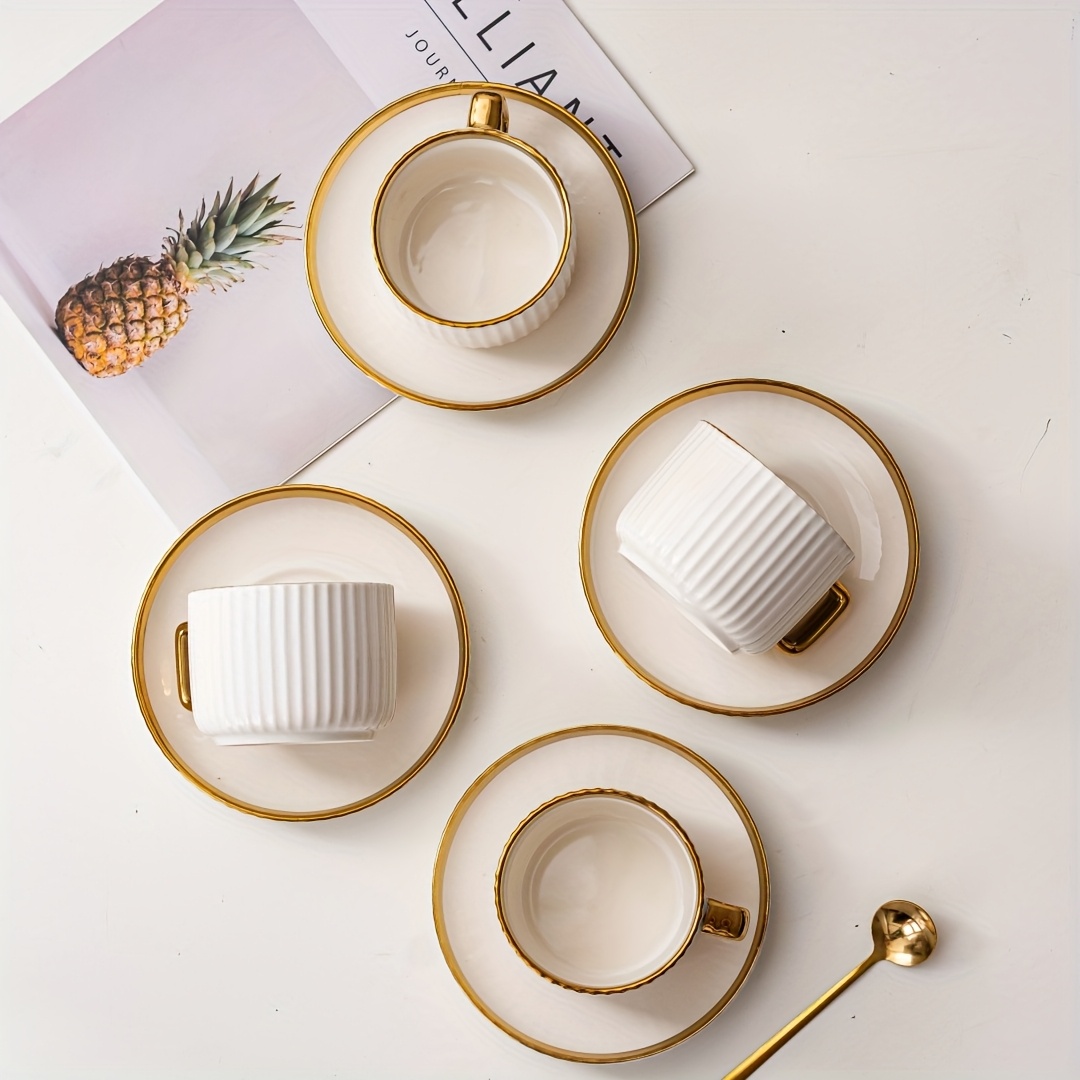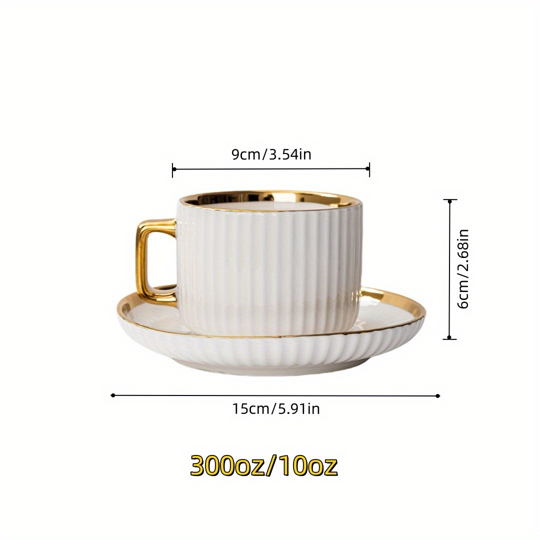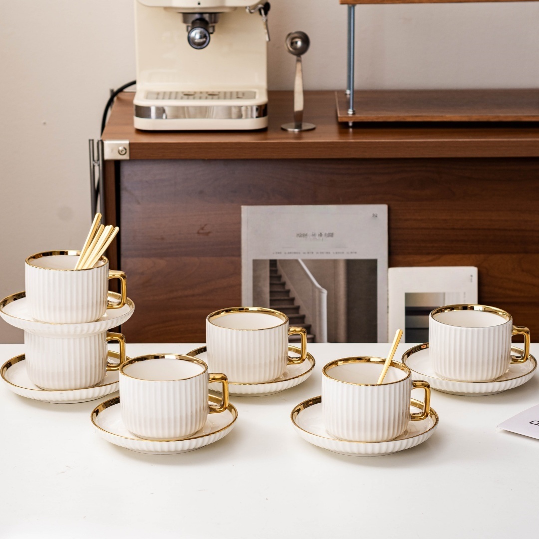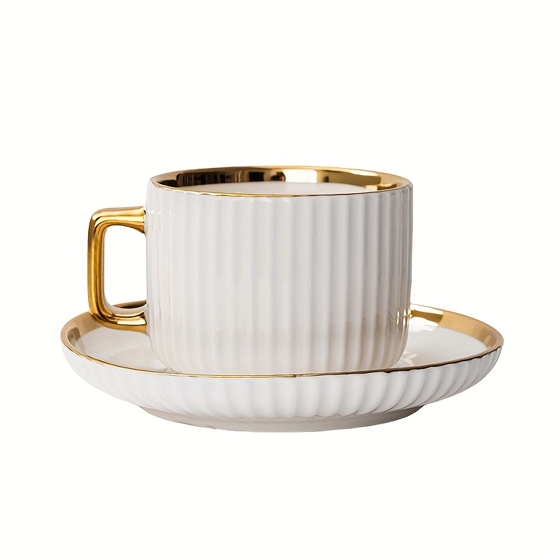 6 tasses à café en céramique blanche élégante avec bordures dorées – soucoupes assorties, idéales pour petit-déjeuner, thés et plus, parfaites pour cadeaux de Noël et Saint-Valentin | Tasses en céramique élégantes | Ensemble durable en céramique, set de t