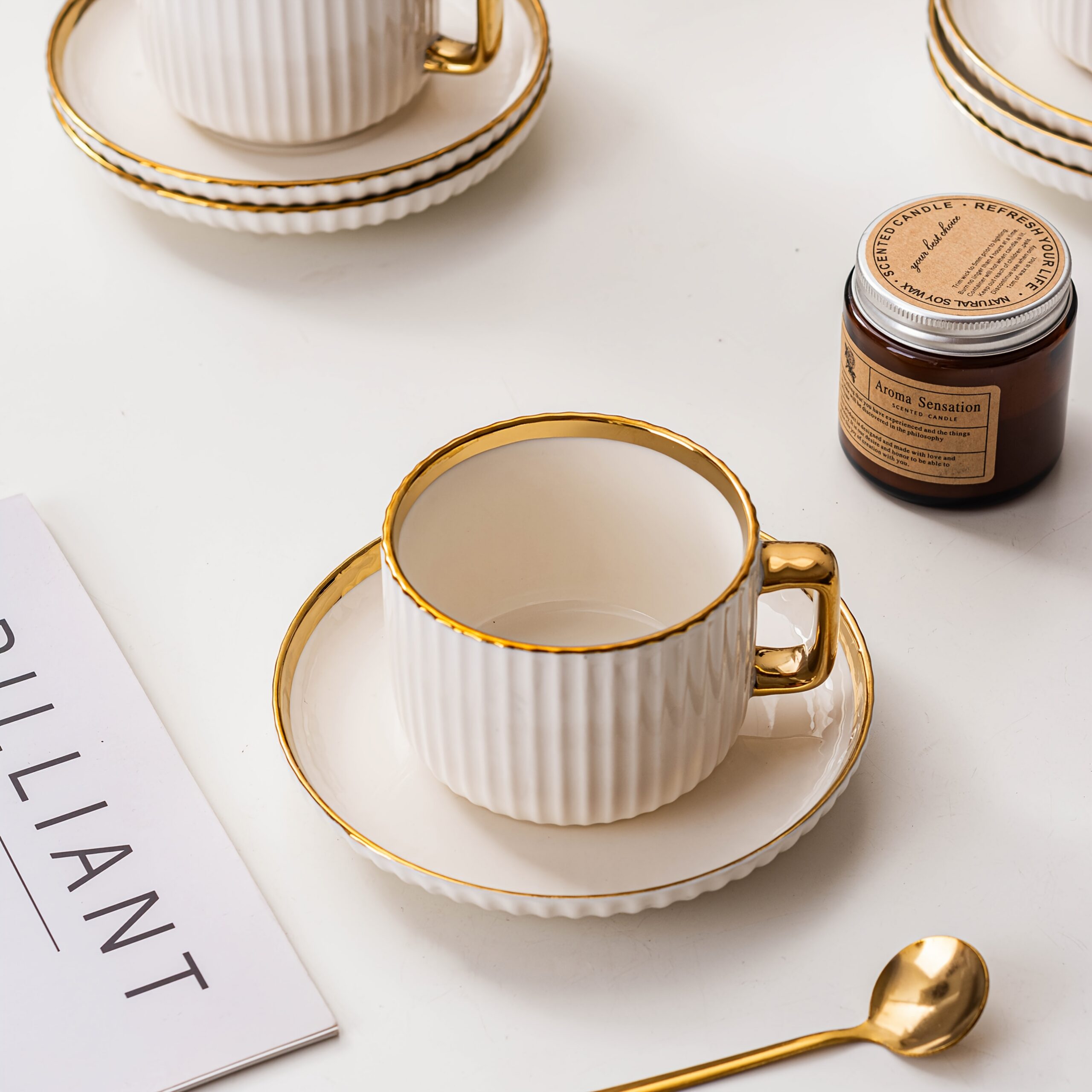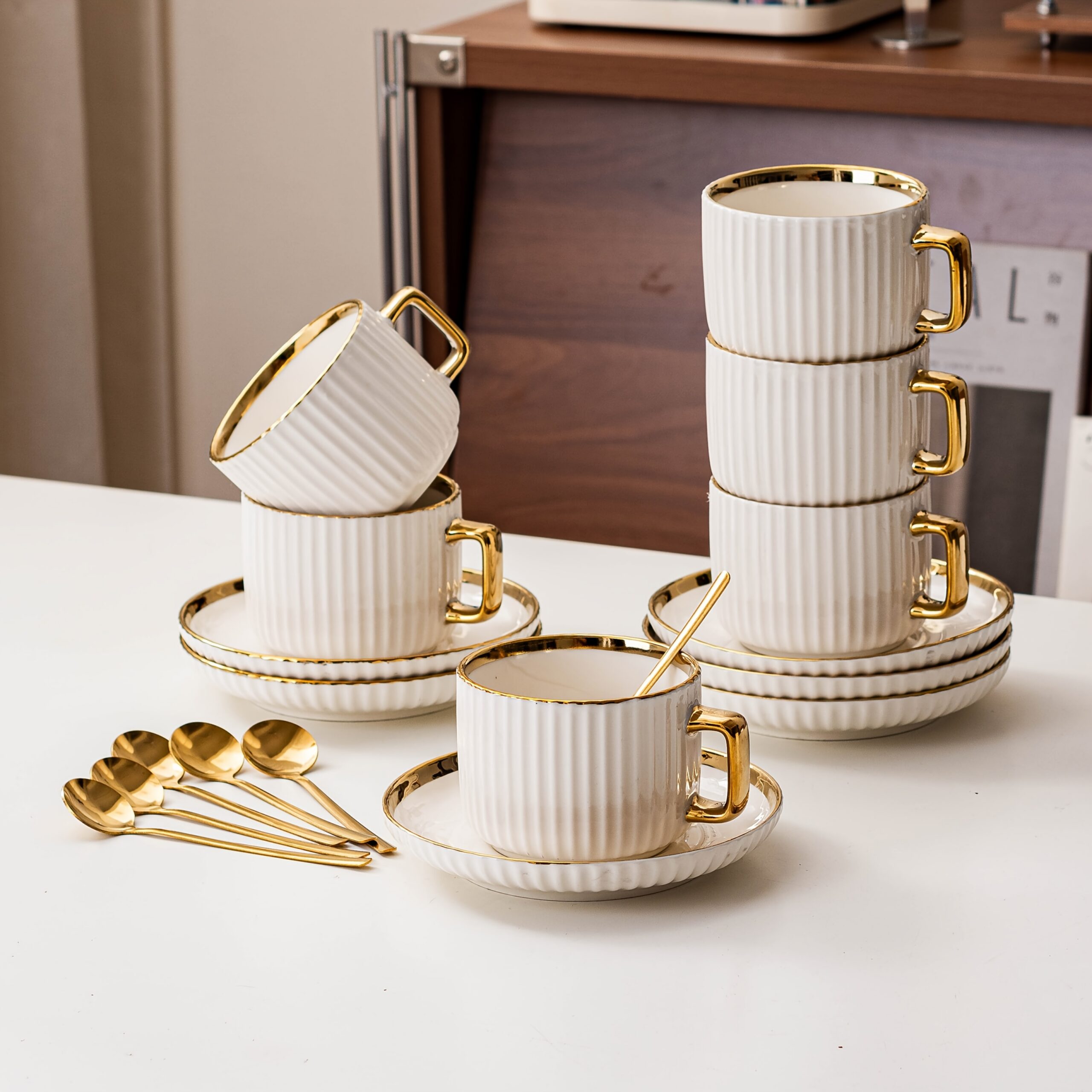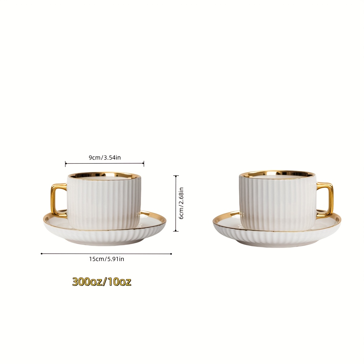 6 tasses à café en céramique blanche élégante avec bordures dorées – soucoupes assorties, idéales pour petit-déjeuner, thés et plus, parfaites pour cadeaux de Noël et Saint-Valentin | Tasses en céramique élégantes | Ensemble durable en céramique, set de t