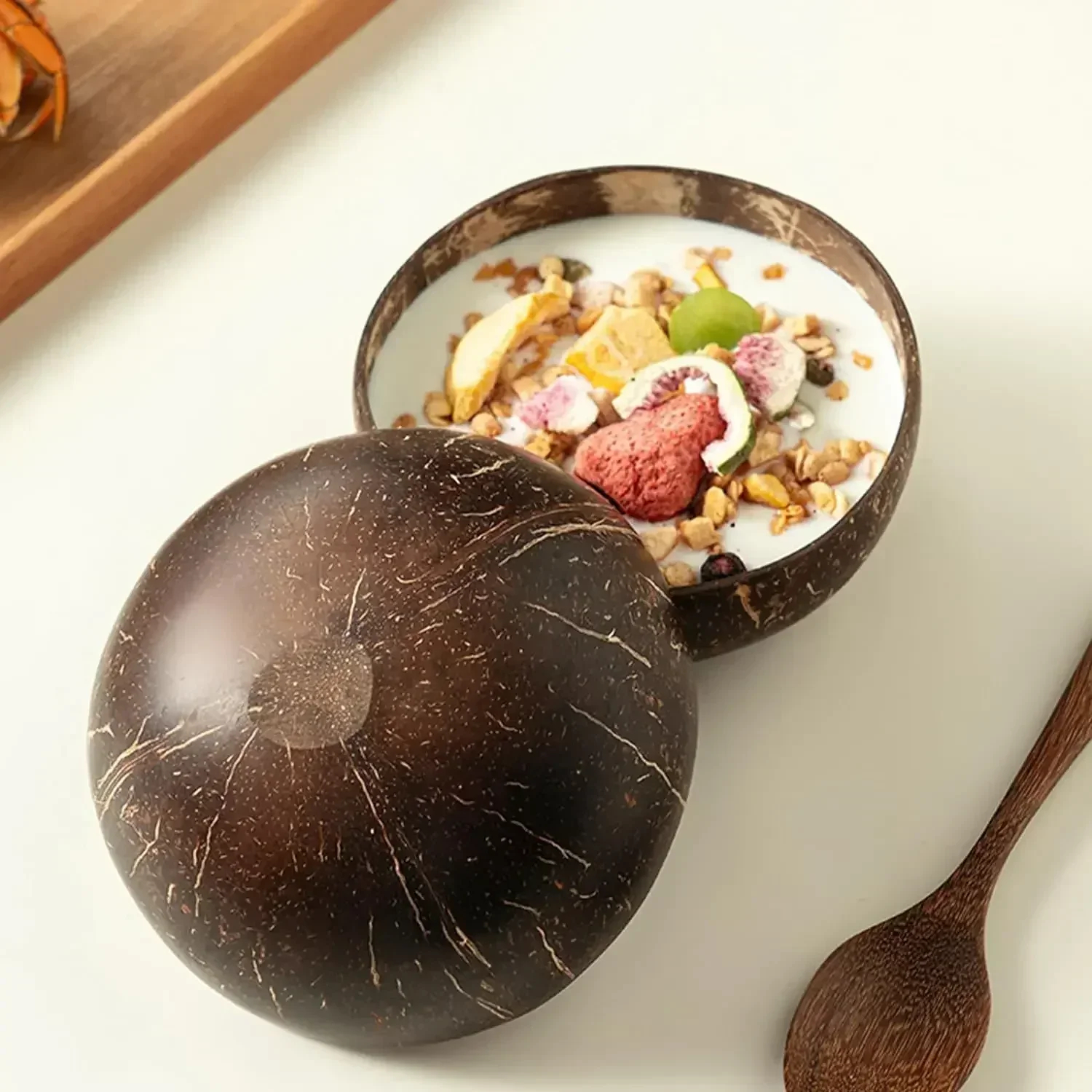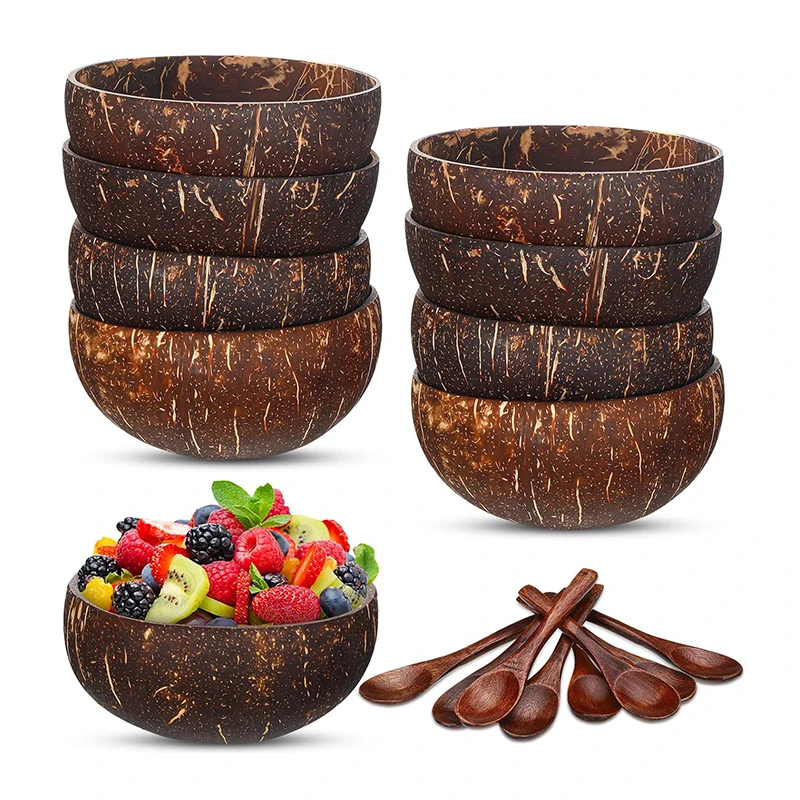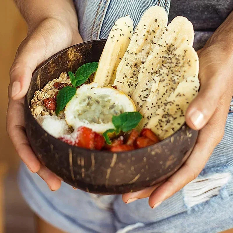Bol en coquille de noix de coco naturelle avec cuillère bol à yaourt bol en bois bols en noix de coco poli salade de fruits Dessert cuillère en bois ensembles arc
