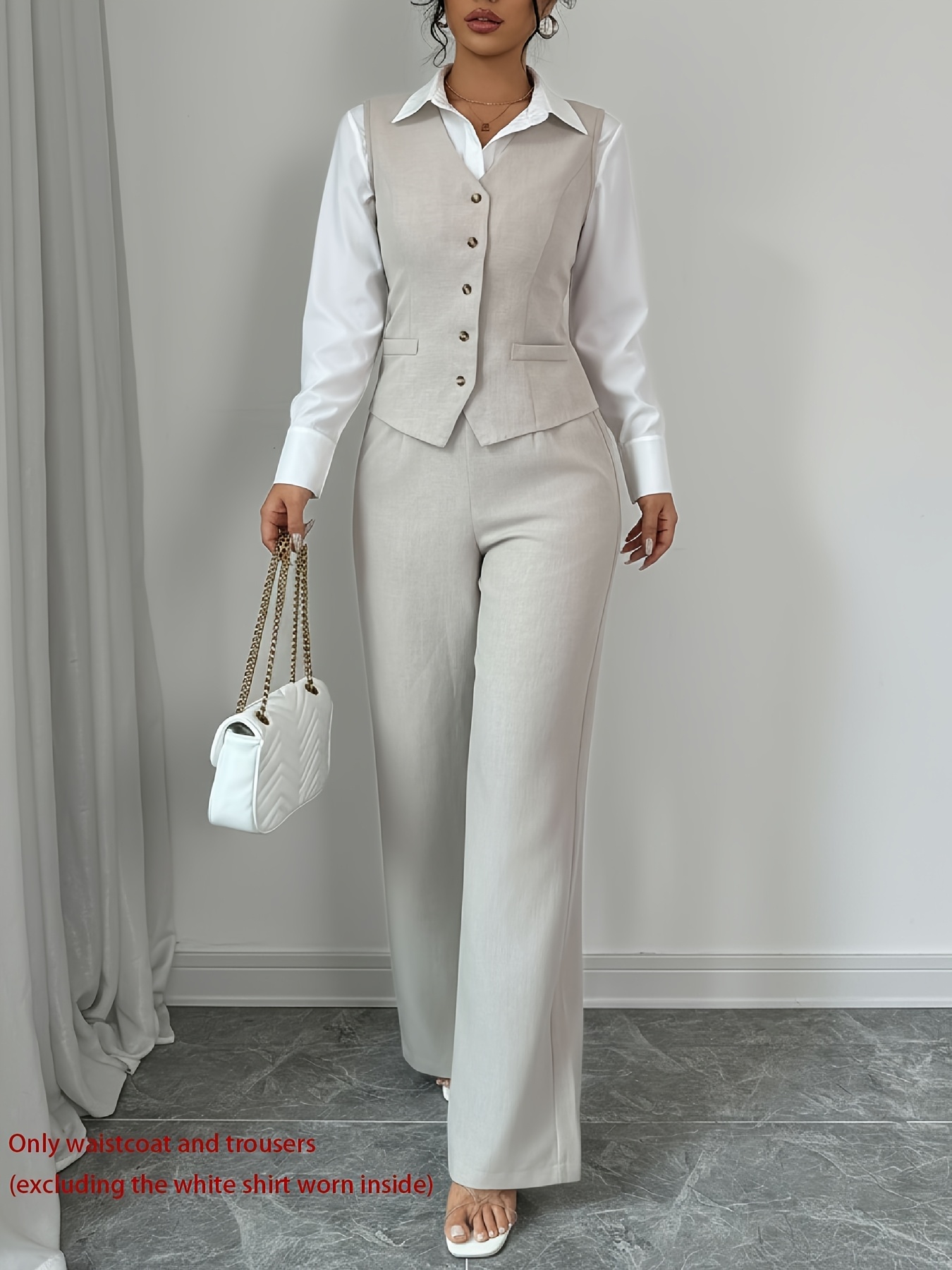 Accueil›Habillement›[Collection Estivale Élégante] Une Nouvelle Collection Estivale Féminine Décontractée, Élégante et Exclusive, Composée d'un Gilet Sans Manches Uni à Boutonnage Simple et d'un Pantalon Large à Taille Haute