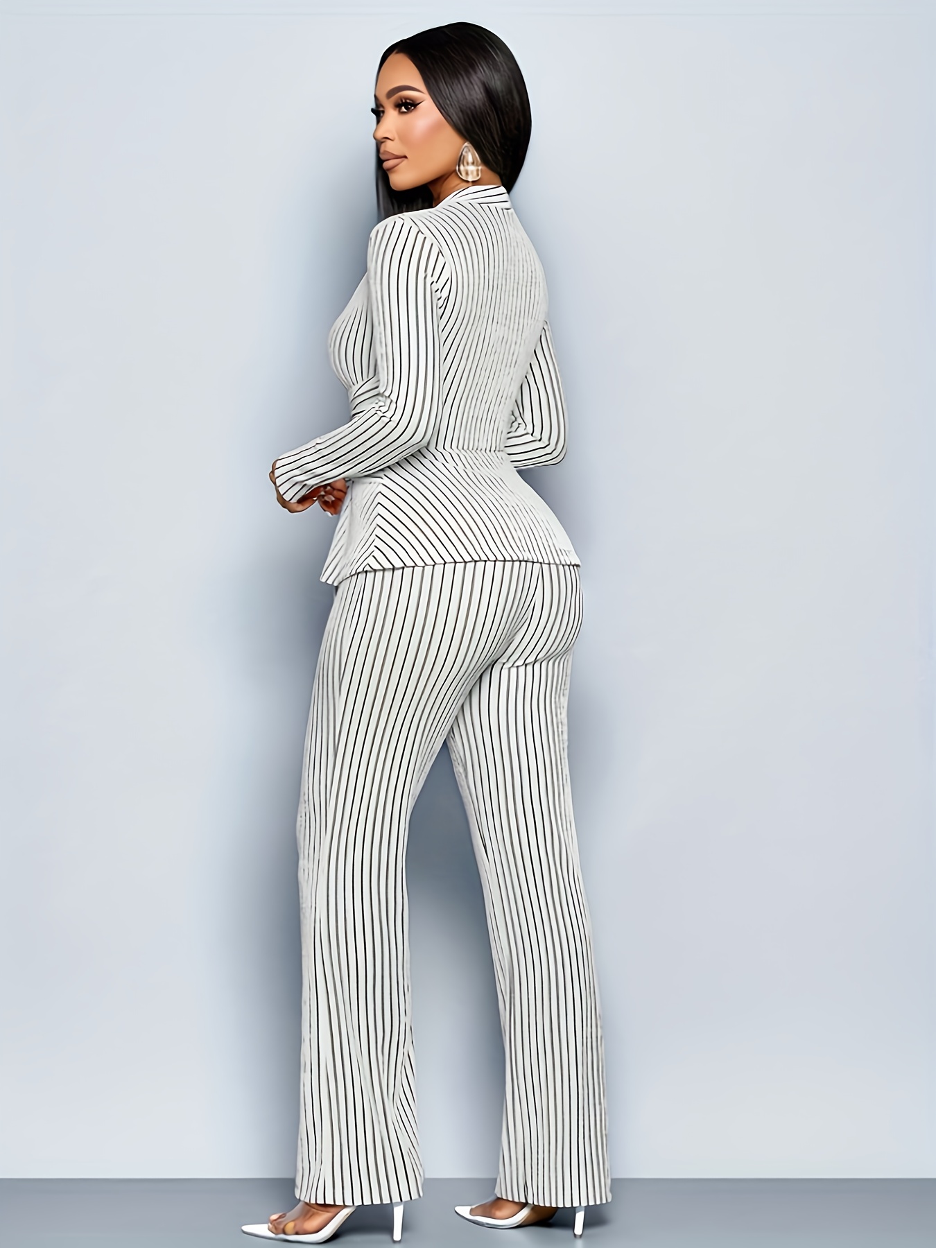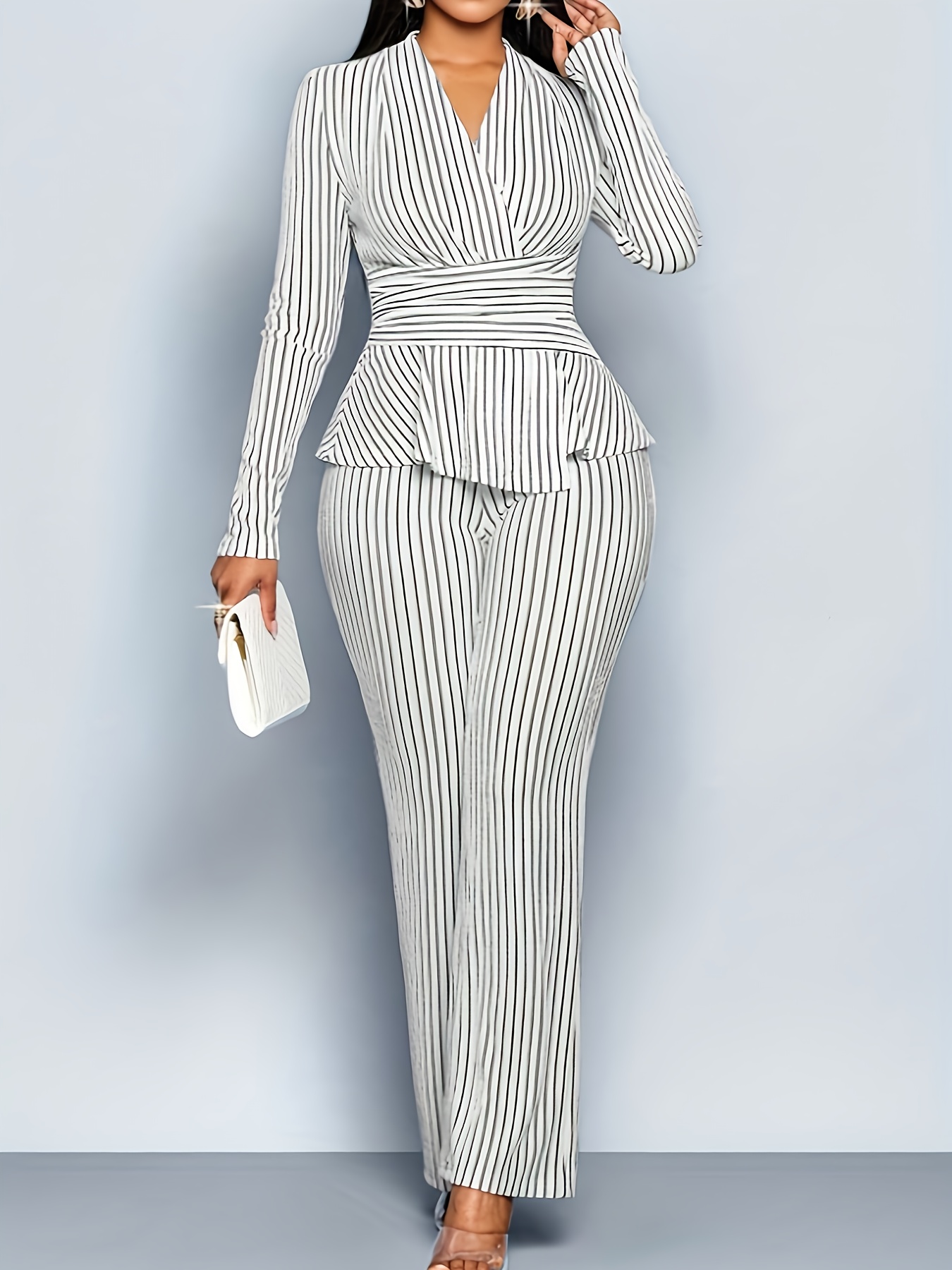 Accueil›Habillement›Ensemble Deux Pièces Élégant pour Femme : T-Shirt à Manches Longues et Col en V à Rayures et Pantalon Large, Ourlet Asymétrique, Tenue Décontractée, Vêtements d'Hiver pour Femme, Ensemble Automne à Motifs Floraux Aléatoires