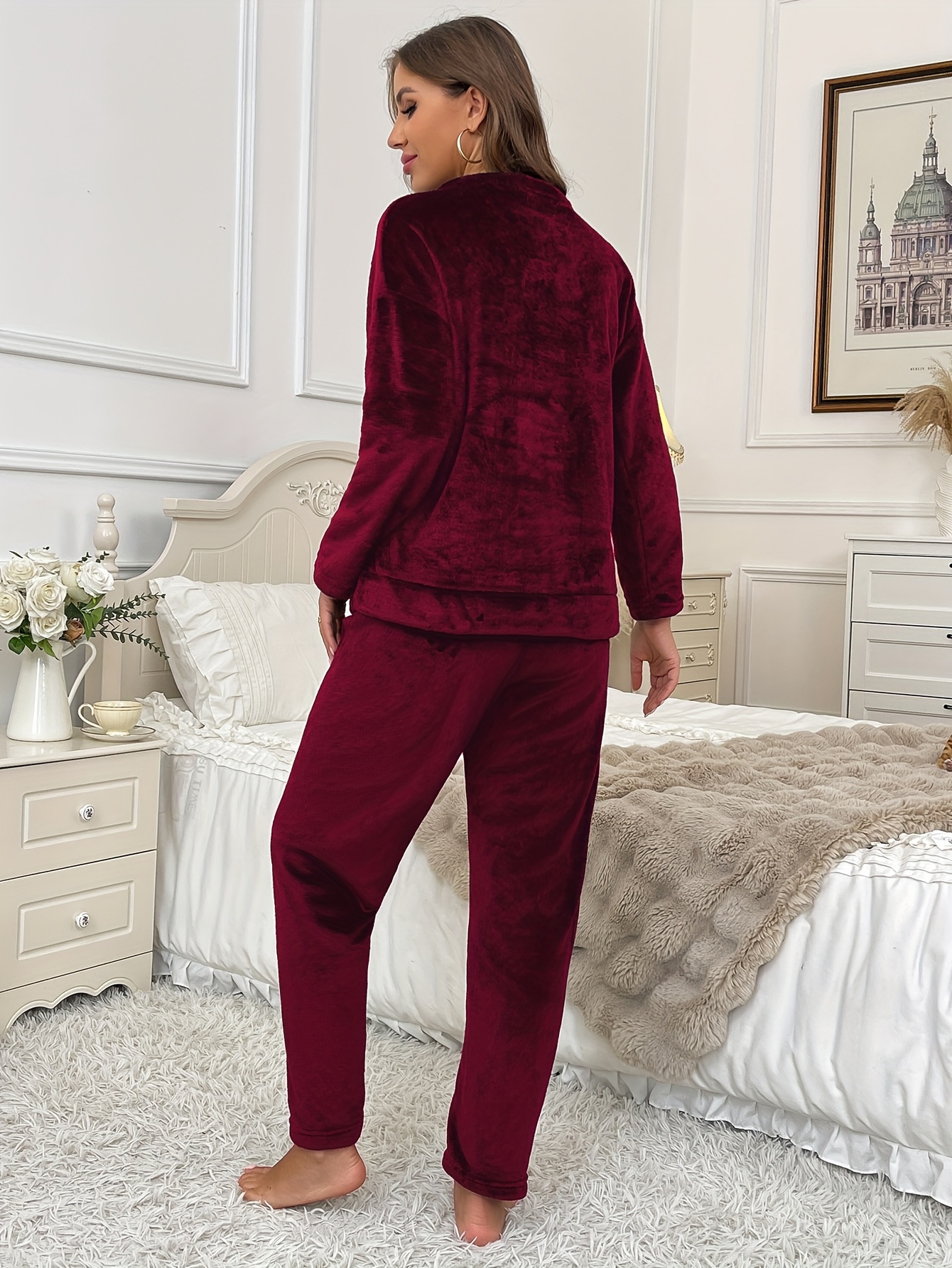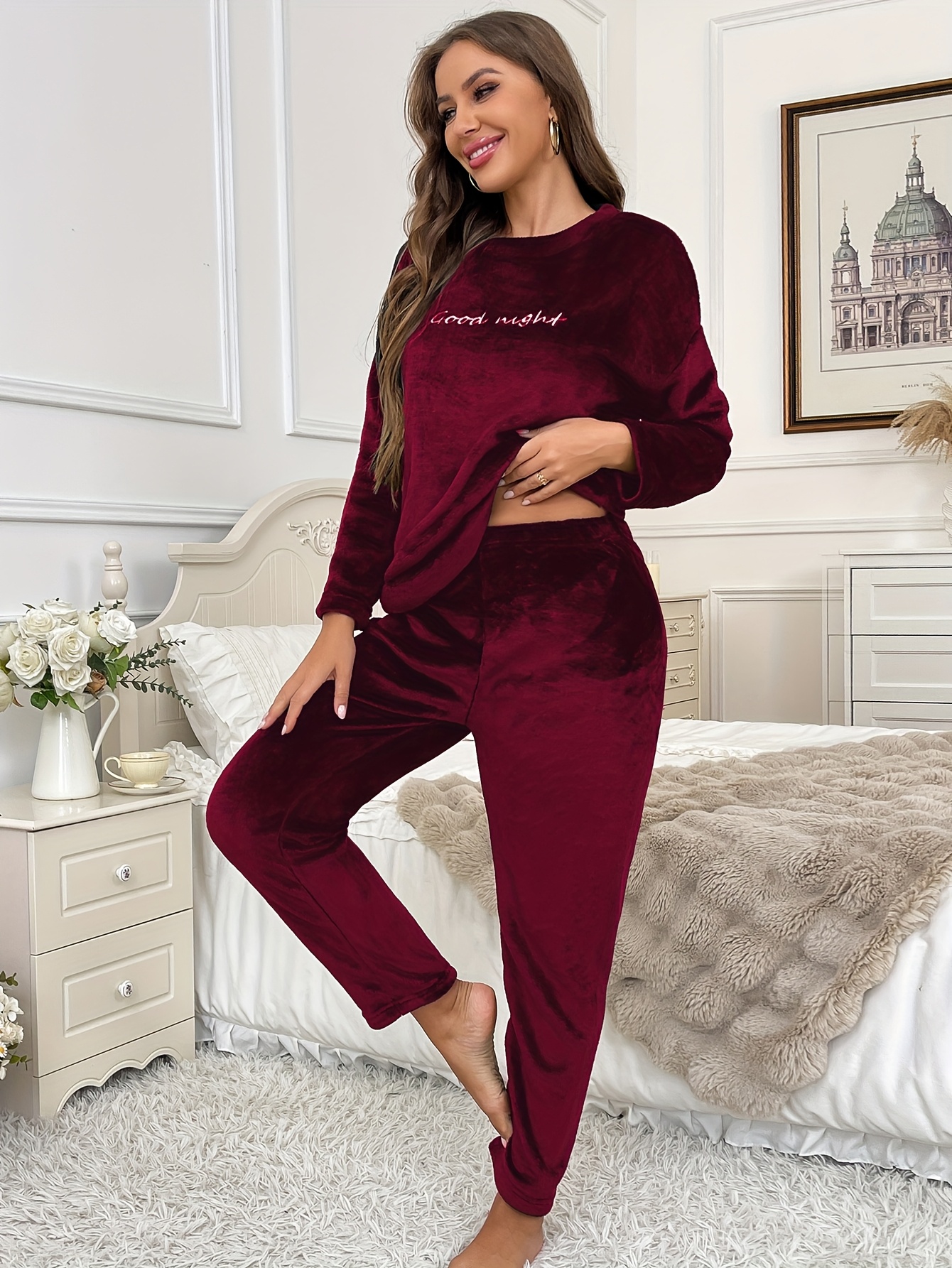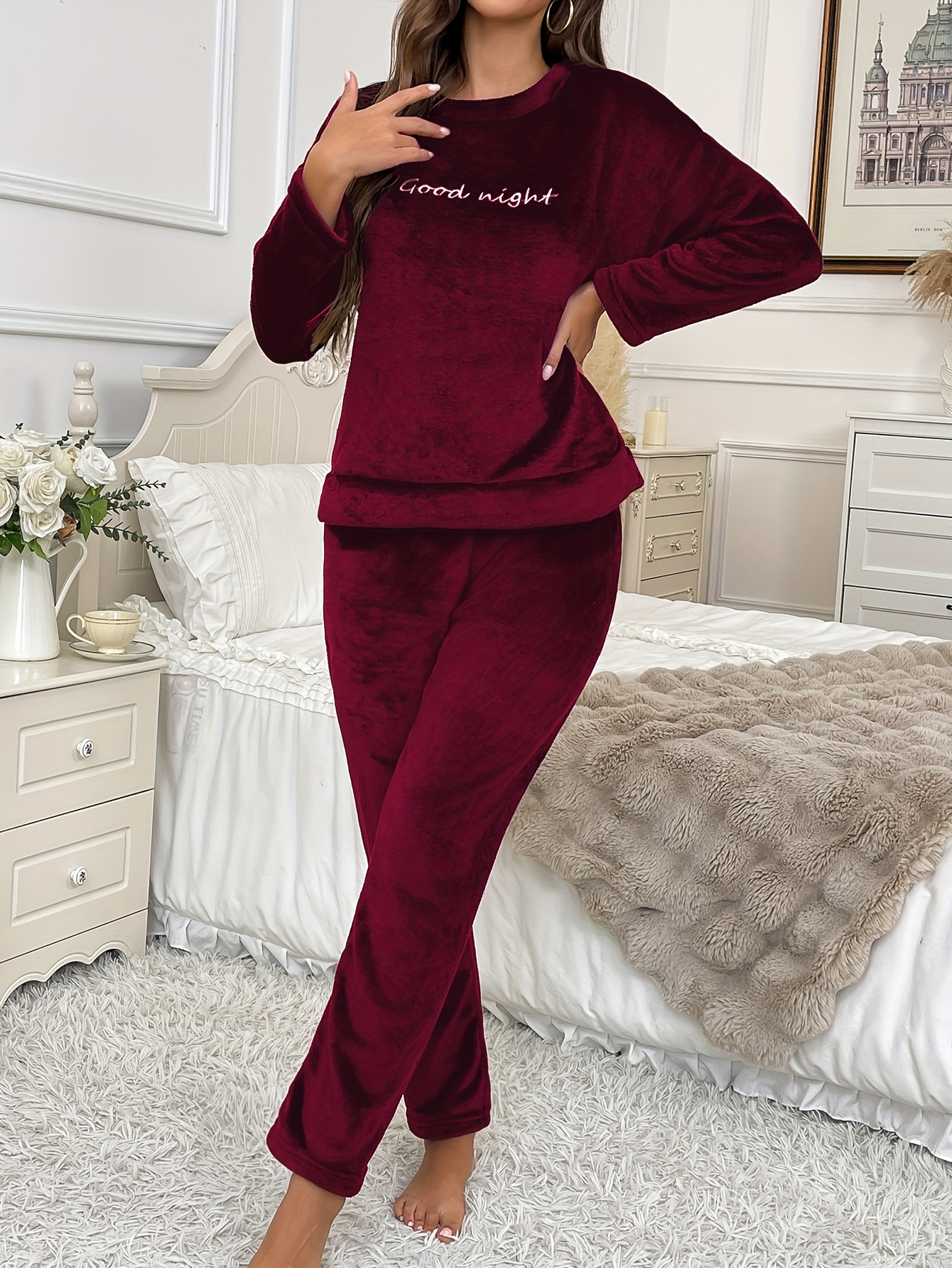 Accueil›Habillement›Ensemble Pyjama Femme Grande Taille, Hiver Automne en Flanelle Polaire Corail à Manches Longues et Pantalon avec Broderie Lettres Style Décontracté Confortable Chaud Noir Tenue de Détente