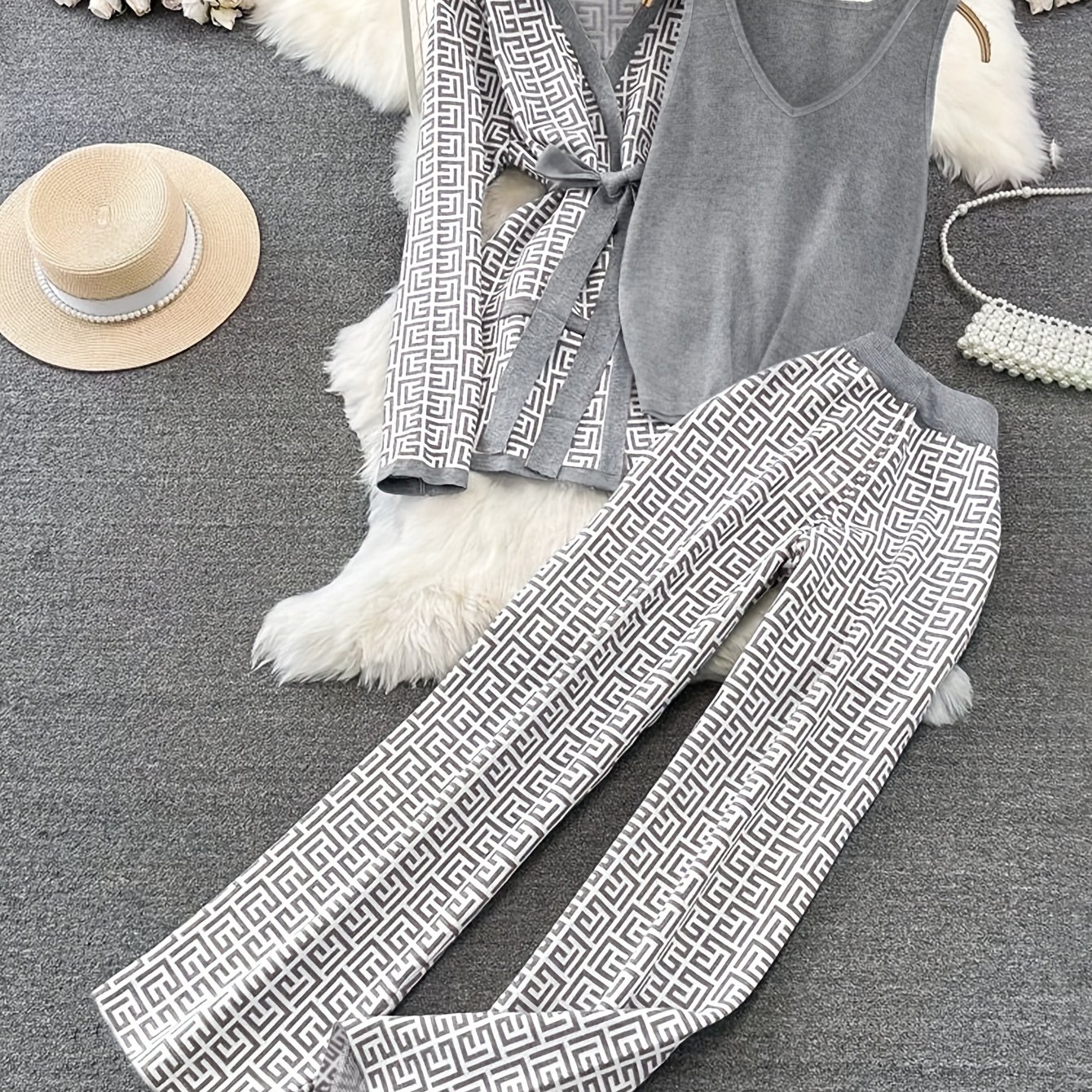 Accueil›Habillement›Ensemble vintage style français 3 pièces – Veste élégante col V, haut et pantalon large, lavable en machine, tenue toutes saisons pour le quotidien ou occasions habillées
