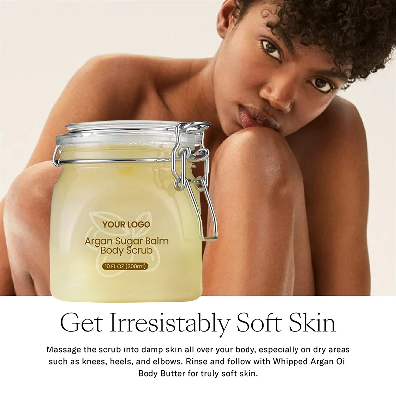 Gommage Corporel OEM ODM au Sel de Mer Exfoliant Lissant Éclaircissant Parfum Noix du Maroc et Sucre Non Testé sur les Animaux