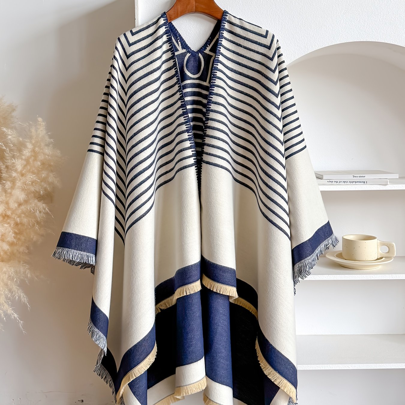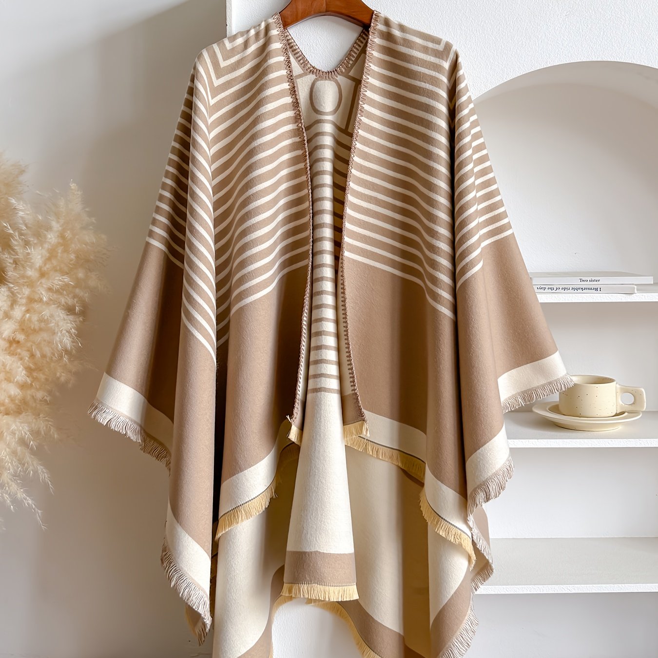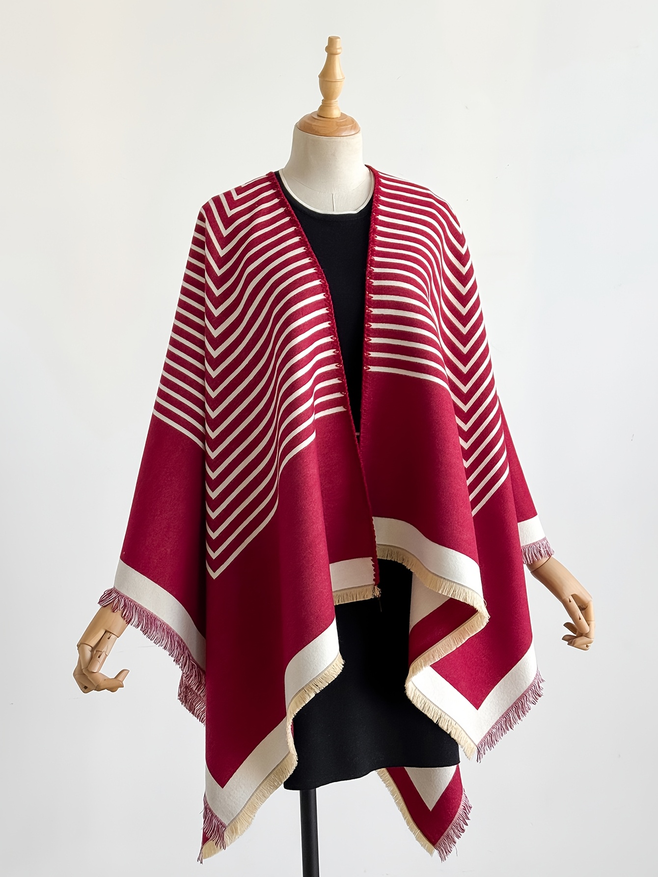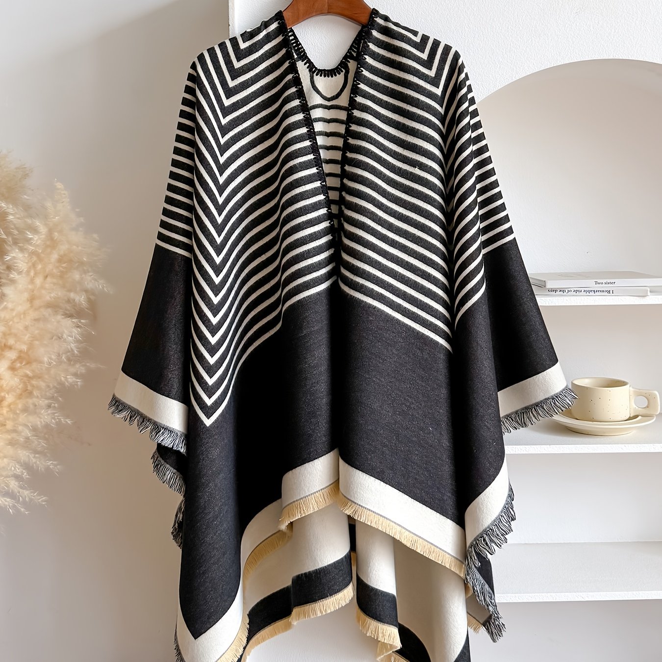 Accueil›Habillement›Accessoires de mode›Grande Taille – Châle Jacquard Rayé en Fausse Duveté Cachemire | Cardigan d'Hiver Grande Taille Style Minimaliste, Doux & Chaud, Réversible, Idéal pour le Travail, les Réunions, les Tenues Quotidiennes, Tissu Non Extensible, Motif Géométrique, Ourlet Fend