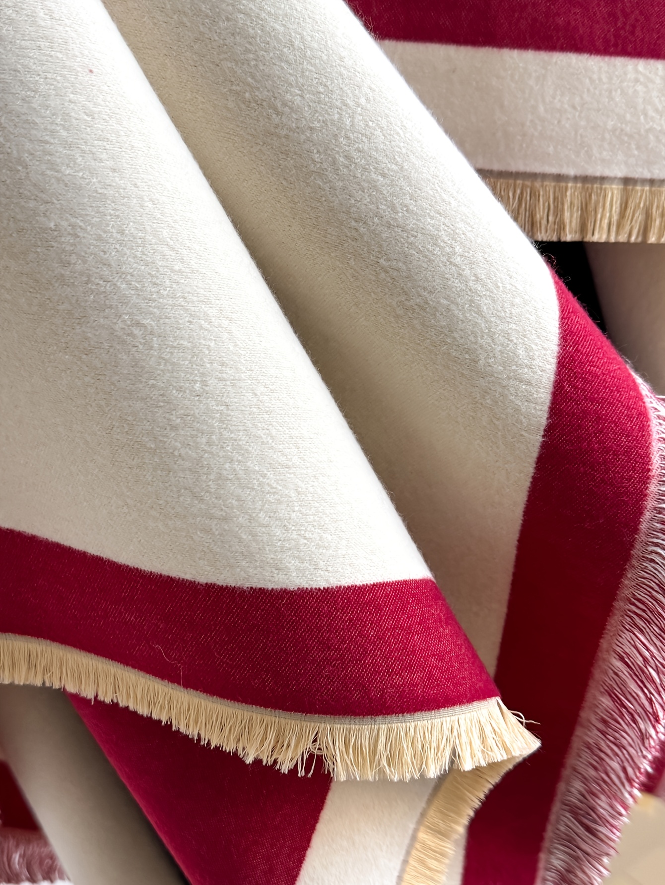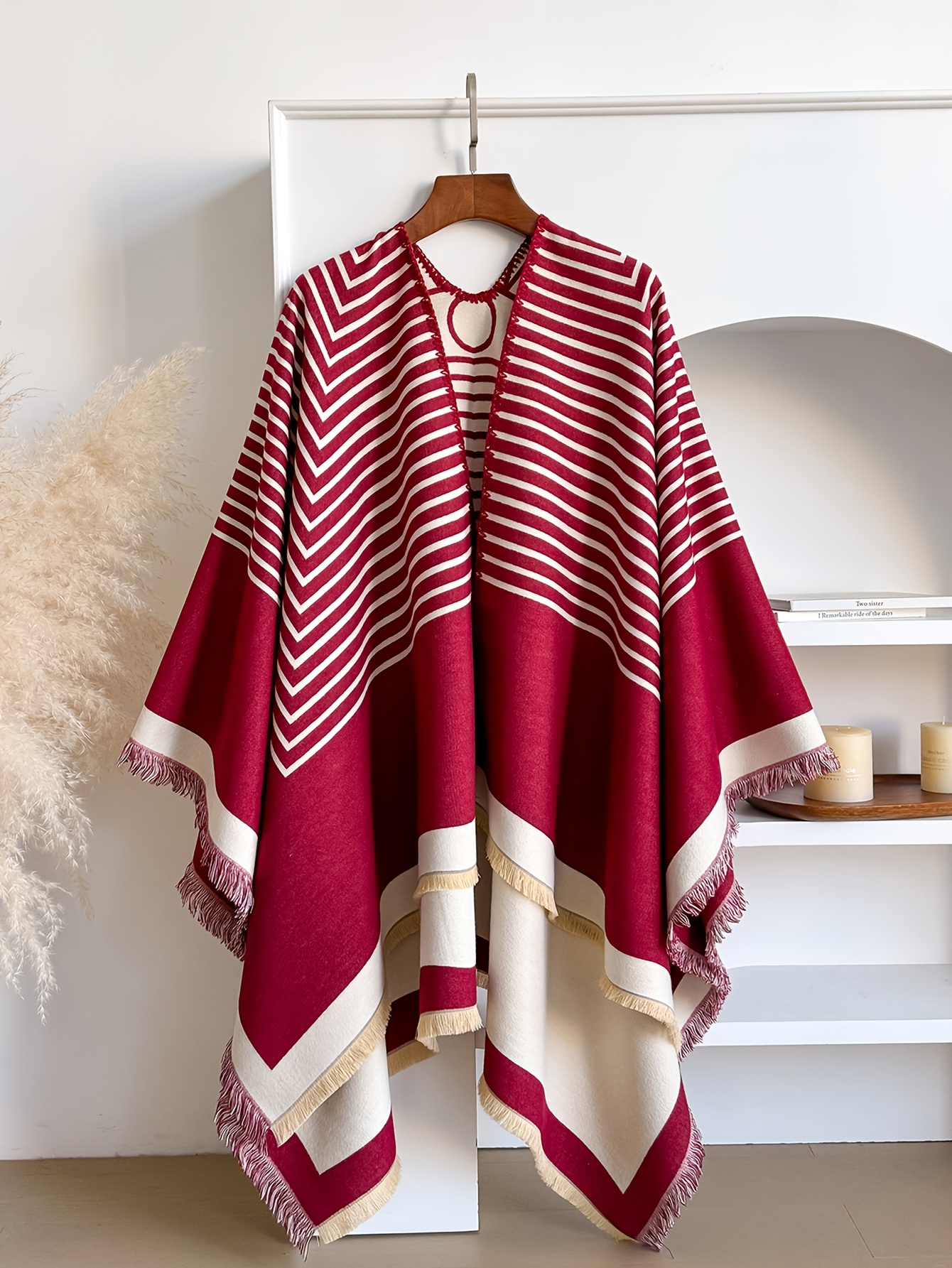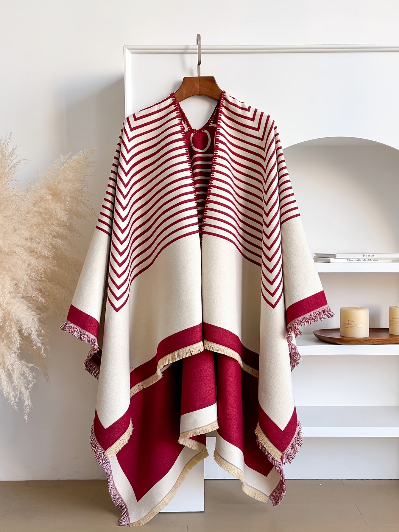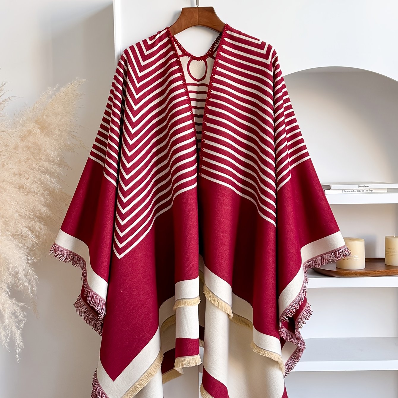 Accueil›Habillement›Accessoires de mode›Grande Taille – Châle Jacquard Rayé en Fausse Duveté Cachemire | Cardigan d'Hiver Grande Taille Style Minimaliste, Doux & Chaud, Réversible, Idéal pour le Travail, les Réunions, les Tenues Quotidiennes, Tissu Non Extensible, Motif Géométrique, Ourlet Fend