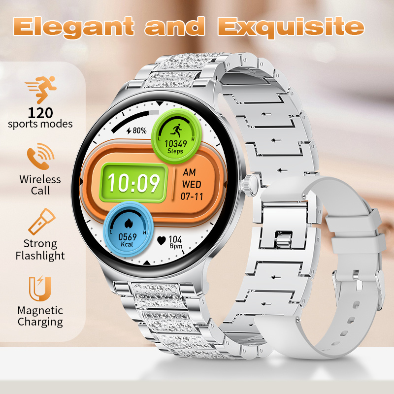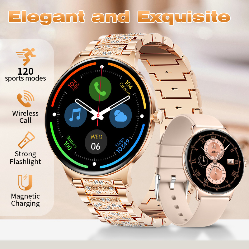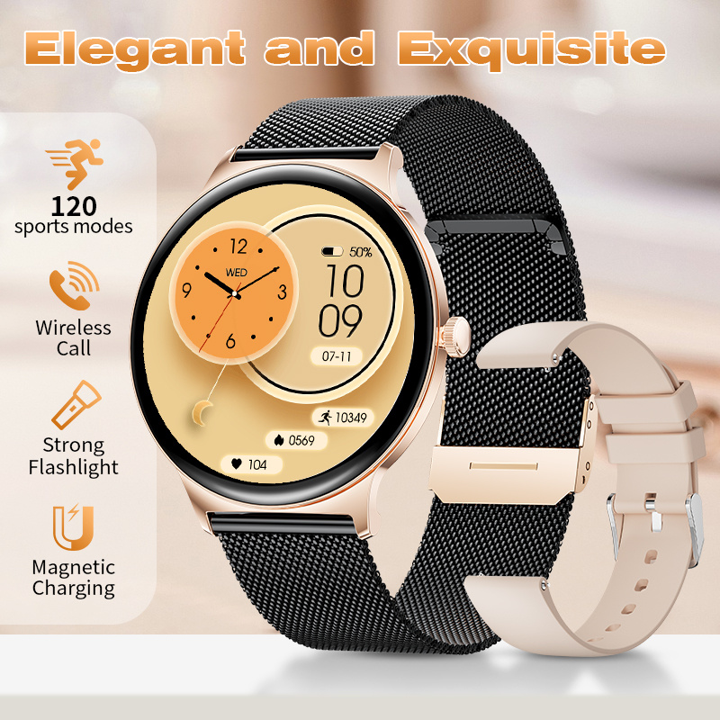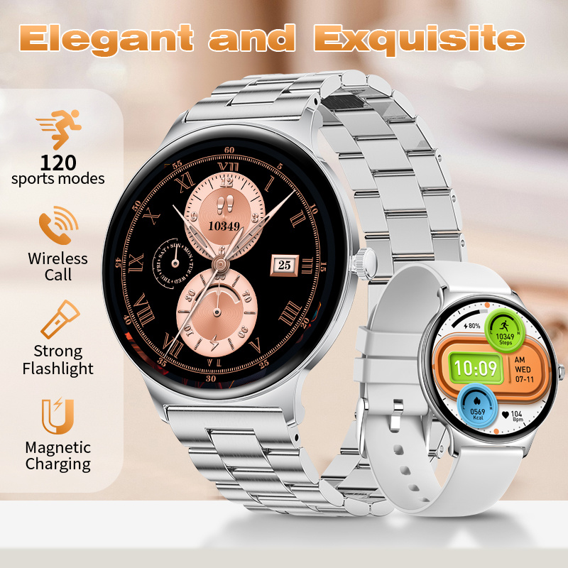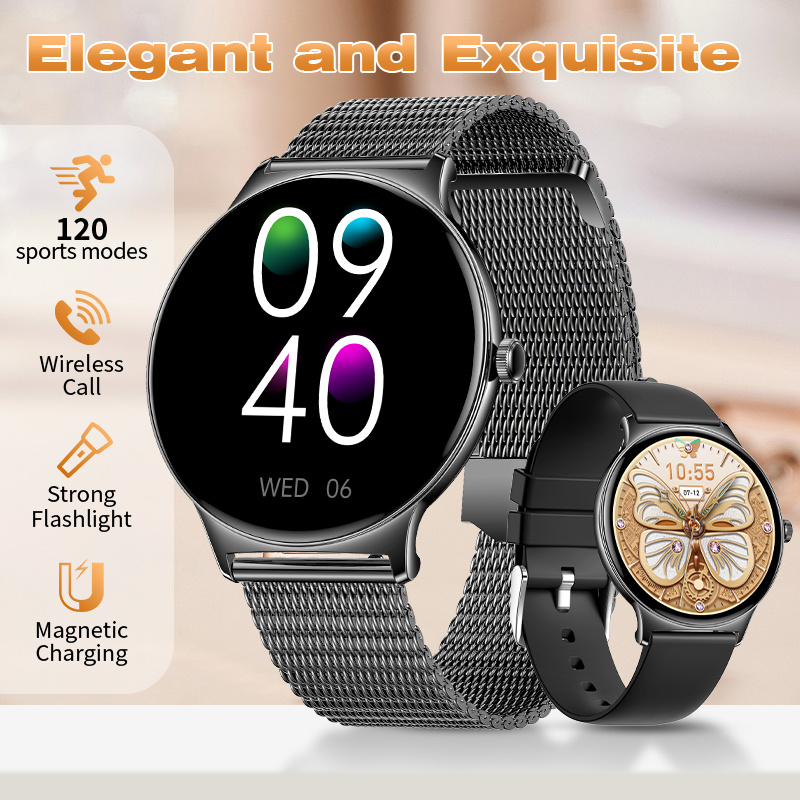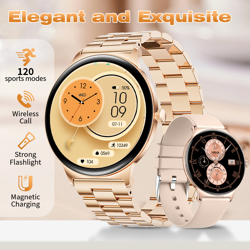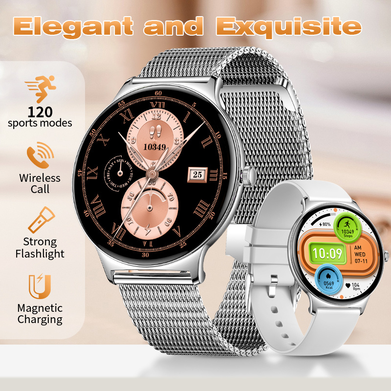 Montre connectée ultra-fine pour femme avec appel sans fil, écran tactile AMOLED 1,43&quote;, affichage toujours actif, podomètre, suivi de la condition physique, plus de 100 modes sportifs, rappel de message, moniteur de sommeil, suivi du cycle, compatible And