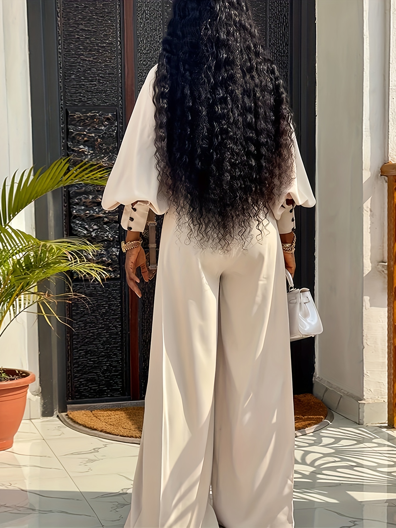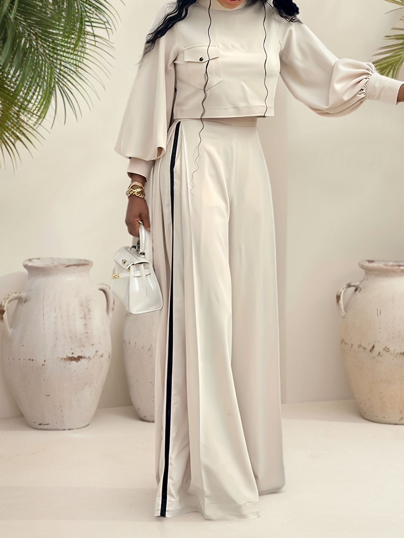 Accueil›Habillement›Un ensemble élégant et stylé pour femmes comprenant un haut à col rond avec une poche unique et des manches bouffantes, associé à un pantalon taille haute et ample avec deux poches.