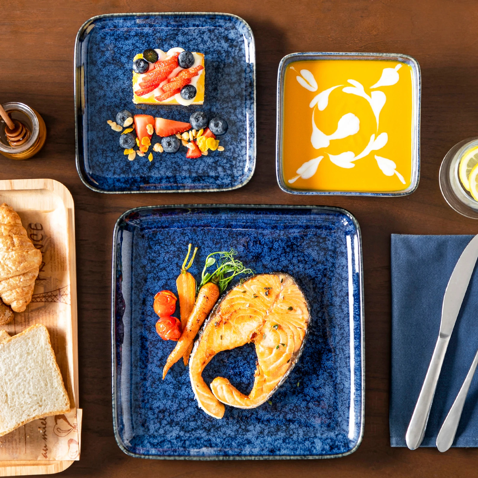 vancasso -Ensemble de rangement en céramique, carré bleu, glaçure réactive, avec 4/8/12 pièces, assiettes à dessert et bols, 12/24/36 pièces